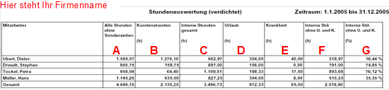 - Spalte C: Alle Stunden, die auf Projekte der eigenen Firma gebucht worden sind, mit Ausnahme von Einträgen, die auf Sonderzeiten (Urlaub, Krankheit, Berufsschule usw.) erfasst wurden. Die Festlegung „eigene Firma“ erfolgt über die Abfrage der Stammnummer des Kunden „eigene Firma“.