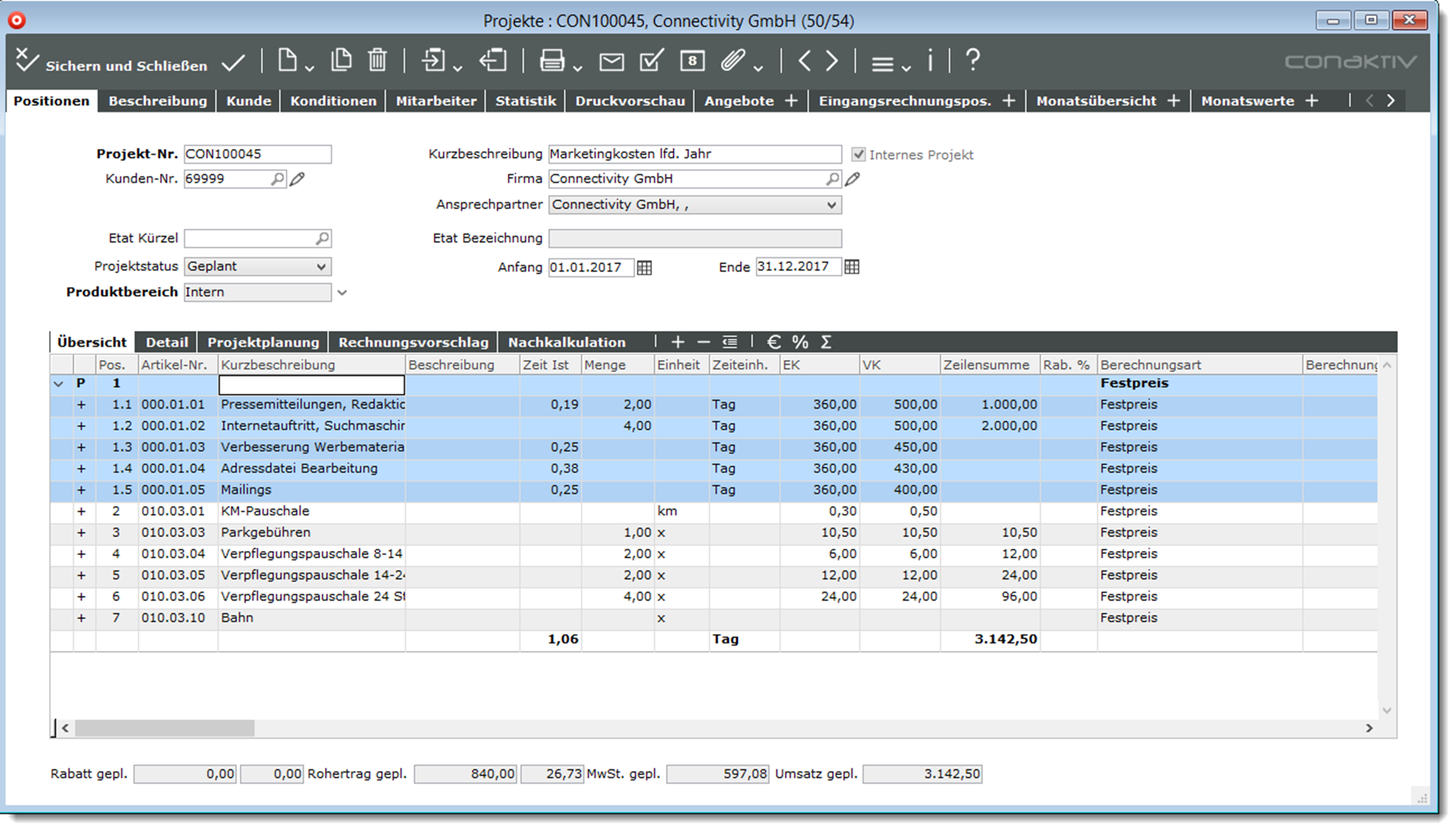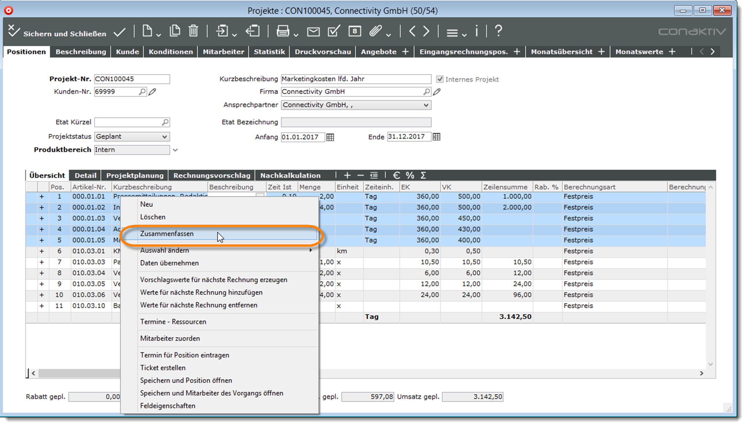 Möchten Sie innerhalb der Positionsliste mehrere aufeinander folgende Einzelpositionen zu einem Leistungspaket zusammenzufassen, dann markieren Sie die gewünschten Positionen in der Positionsliste und klicken mit der rechten Maustaste (FFA) auf die Markierung und wählen Sie die Funktion „Zusammenfassen“ aus.
