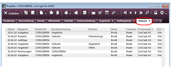Weiterhin bietet es sich an, eine Historienliste in die Eingabemaske der Module „Kunden“, „Lieferanten“, „Adressen“ oder „Projekte“ auf einer eigenen Registerkarte zu integrieren.