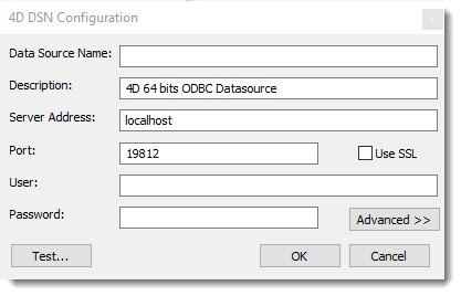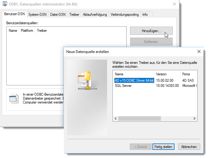 Markieren Sie in der Liste den Eintrag „4D vXX ODBC Driver XX-bit“ und klicken Sie dann auf den Knopf „Fertig stellen“. Es erscheint der Dialog „4D DSN Configuration“.