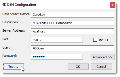 Sie können nun die ODBC-Verbindung zum ConAktiv®-Server testen. Geben Sie hierzu in das Feld „User“ den Benutzernamen „4DOpen“ und in das Feld „Password“ das von Ihnen festgelegte Kennwort ein.