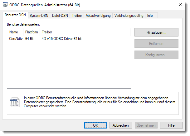 Klicken Sie auf den Knopf „Test…“. Der ODBC-Treiber versucht nun die Verbindung zum ConAktiv®-Server aufzunehmen und sich über den Benutzernamen und das Kennwort zu autorisieren. Sollte dieser Vorgang nicht erfolgreich sein, werden Sie durch eine entsprechende Fehlermeldung darauf hingewiesen. Bei einer erfolgreichen Verbindung wird der Dialog „4D DSN Configuration“ geschlossen und die neue Benutzer-DSN wird als Datenquelle im ODBC-Datenquellen-Administrator hinzugefügt.