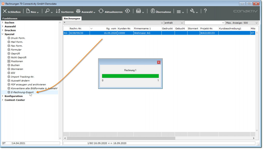 - Erstellung der E-Rechnungsbelege bei Ausführung der Funktion E-Rechnung-Export im Spezialmenü der Rechnungsliste.