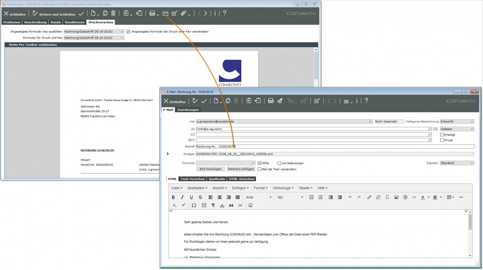 Sie können eine E-Rechnung auch dann erzeugen und mailen, wenn Sie den direkten Versand über Outlook verwenden.