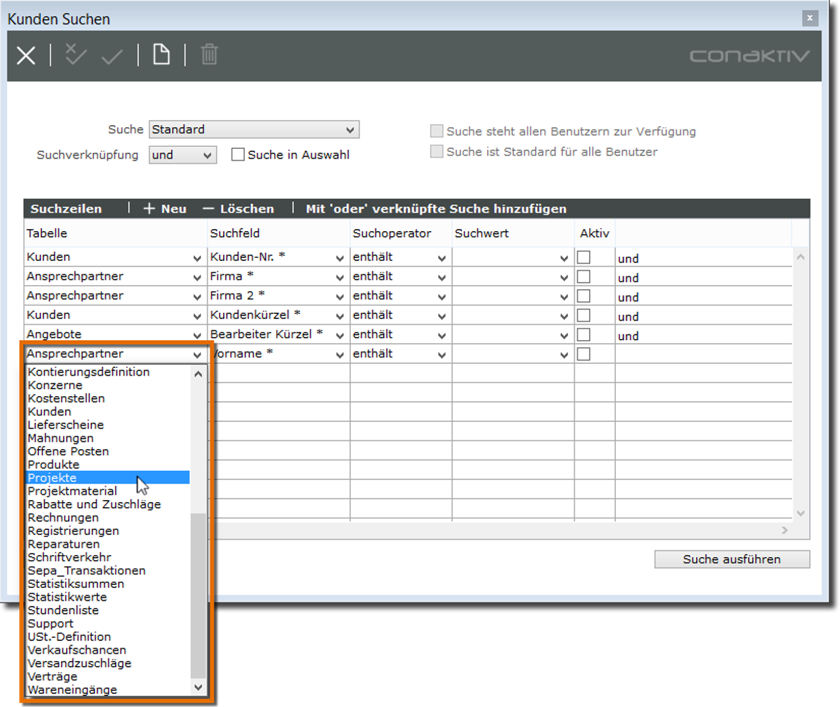 Im Such-Editor können Sie auch in Modulen suchen, deren Datensätze mit denen des aktuell geöffneten Moduls verknüpft sind. Führen Sie z.B. eine Suche im Modul „Kunden“ aus, können Sie neben den Feldern des Moduls „Kunde“ auch in den Feldern der Module „Adressen“, „Angebote“, „Rechnungen“ und „Projekte“ suchen. Suchen Sie z.B. nach den Kunden aus einem bestimmten Postleitzahlenbereich, dann können Sie im Such-Editor das Modul „Adressen“ als Suchtabelle einstellen und nach dem Suchkriterium „PLZ“ suchen.