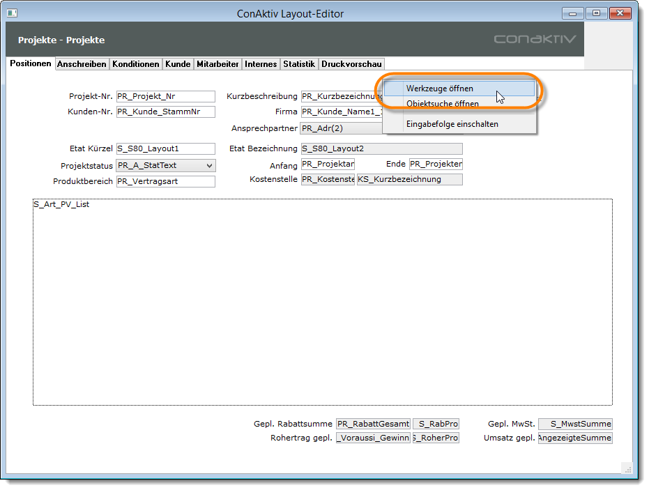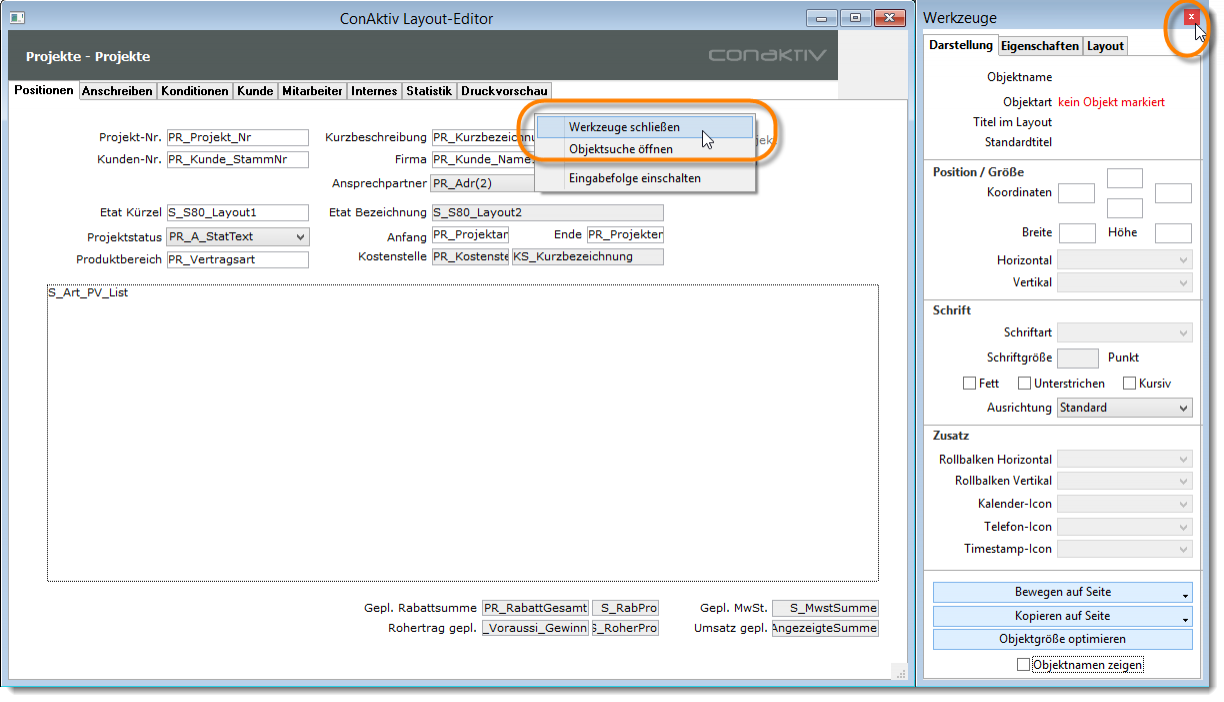 Die Werkzeuge werden standardmäßig bei Start des Layout-Editors geöffnet. Sie können die Werkzeuge entweder über das Schließkreuz schließen oder über das Kontext-Menü (Klick mit der rechten Maustaste), Funktion „Werkzeuge schließen“.