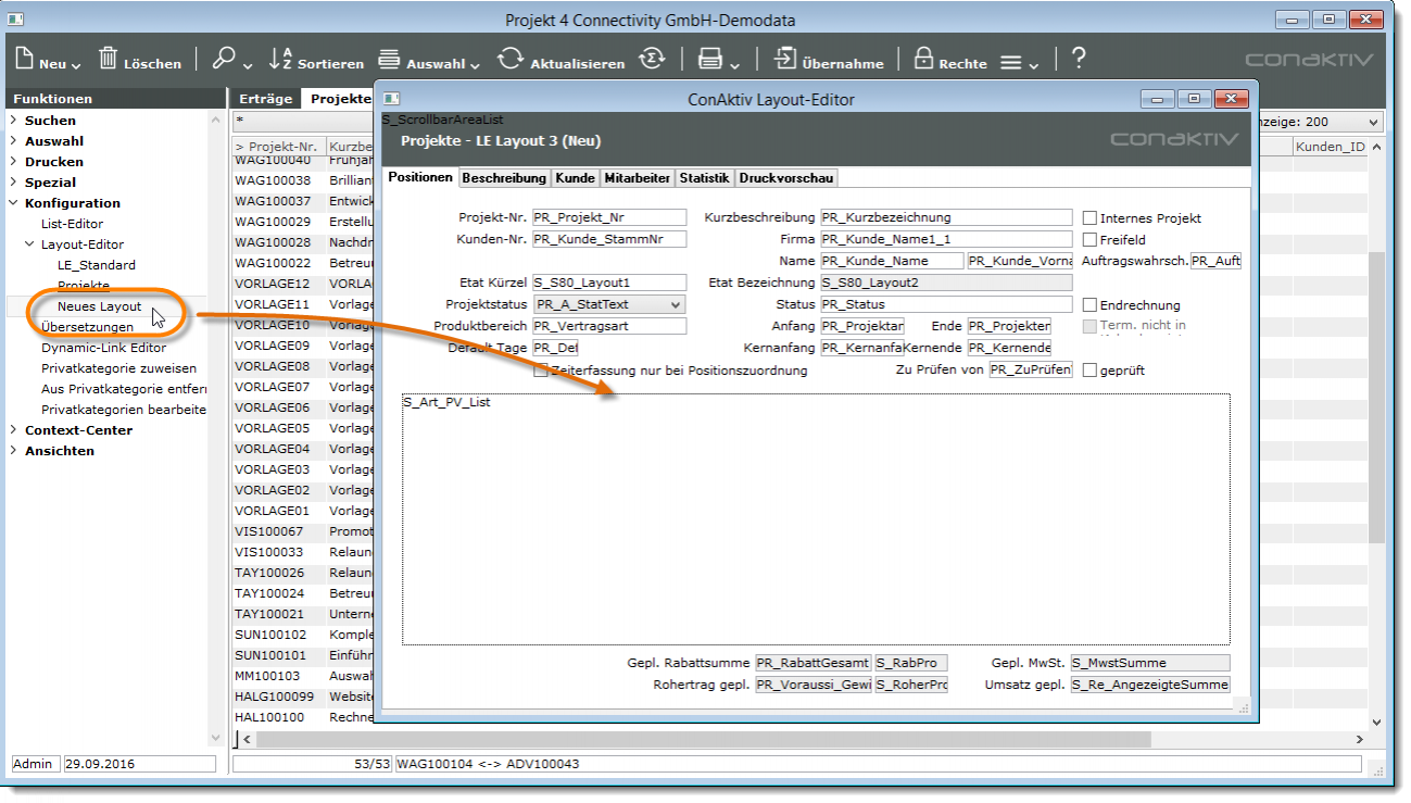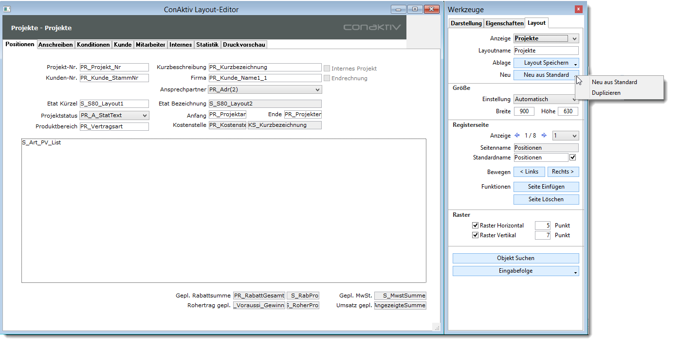Klicken Sie in der Bildschirmliste des betreffenden Moduls im Konfigurationsmenü der Bedienleiste unter dem Punkt „Layout-Editor“ auf die Funktion „Neues Layout“. Der Layout-Editor wird mit dem von ConAktiv® vorgegebene Standardlayout des Moduls gestartet.