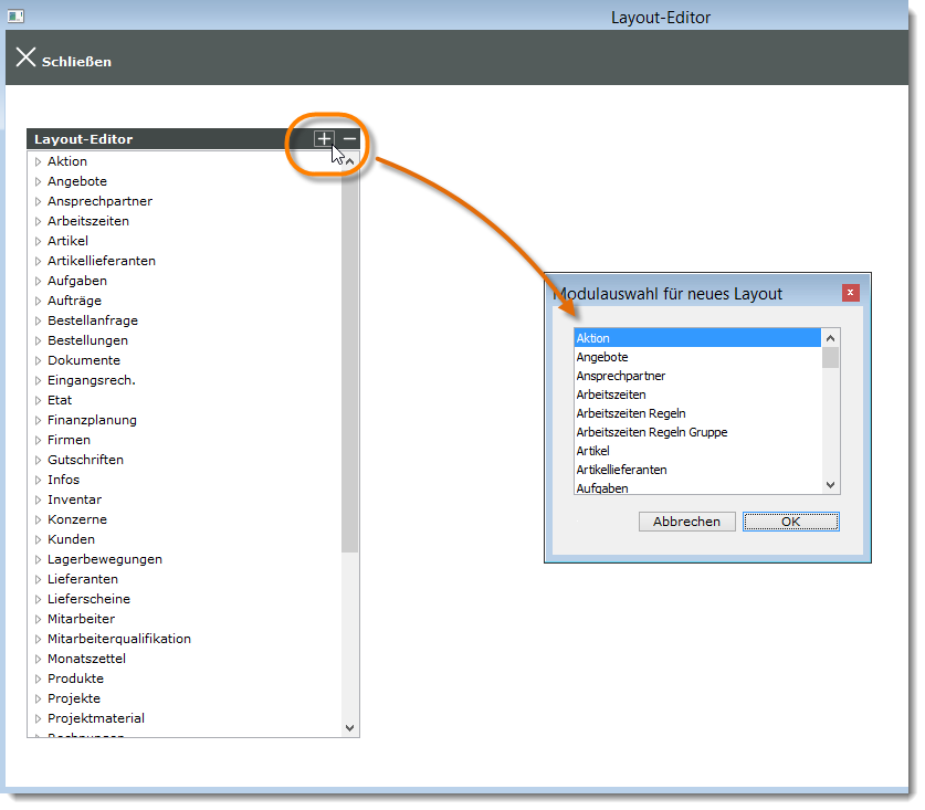 Öffnen Sie das Modul „Systemparameter“ und doppelklicken Sie auf den Eintrag „Layout-Editor“. Es öffnet sich eine Maske mit Einträgen zu den Modulen, zu denen bereits Eingabelayouts erstellt wurden. Klicken Sie in der Titelleiste „Layout-Editor“ auf den Knopf „+“. Es wird eine Auswahlliste geöffnet, in der alle Module angezeigt werden, für die Sie ein Eingabelayout mit dem Layout-Editor erstellen können.
