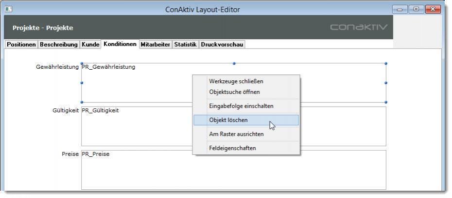 Um ein Objekt zu löschen, klicken Sie es an und betätigen Sie die Entfernen-Taste. Oder klicken Sie mit der rechten Maustaste auf das Objekt und wählen Sie aus dem Kontextmenü den Punkt „Objekt löschen“ aus.
