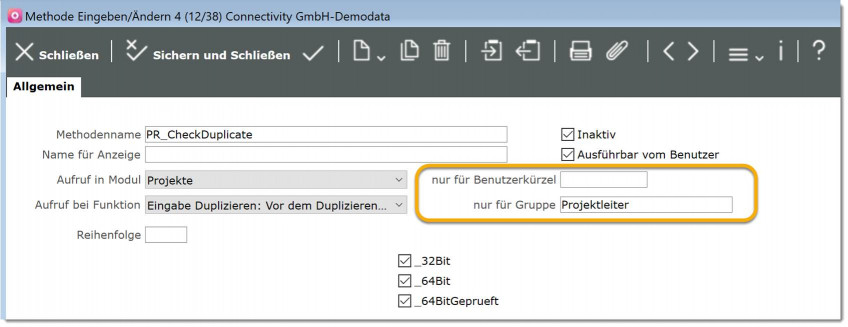 Soll die Methode für jeden Benutzer ausgeführt werden, dann lassen Sie beide Felder leer. Möchten Sie, dass die Methode für mehrere Benutzer ausgeführt wird, die nicht derselben Benutzergruppe zugeordnet sind, duplizieren Sie den Methodendatensatz und tragen jeweils die entsprechenden Benutzerkürzel in den Duplikaten ein. Soll also eine Methode für drei Benutzer ausgeführt werden, muss die gleiche Methode dreimal, jeweils mit dem entsprechenden Benutzerkürzel, angelegt werden.