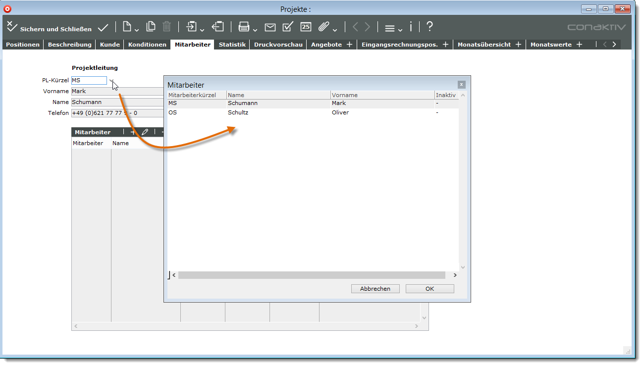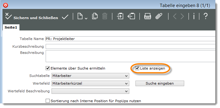 Werden die Tabellenelemente aufgrund einer Suche bestimmt (Ankreuzfeld „Elemente über Suche ermitteln“ aktiv) dann können Sie zusätzlich festlegen, dass bei Klick auf das Dreieck neben dem Tabellenfeld anstelle einer Auswahlliste ein Listenfenster mit dem Suchergebnis geöffnet wird. Aktivieren Sie hierzu das Ankreuzfeld „Liste anzeigen“.