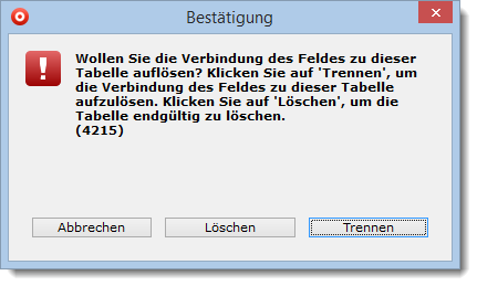 Klicken Sie auf den Knopf „Trennen“, dann wird lediglich die Zuordnung zwischen dem Feld und der Tabelle gelöscht. Die Tabelle mit ihren Elementen ist weiterhin vorhanden.