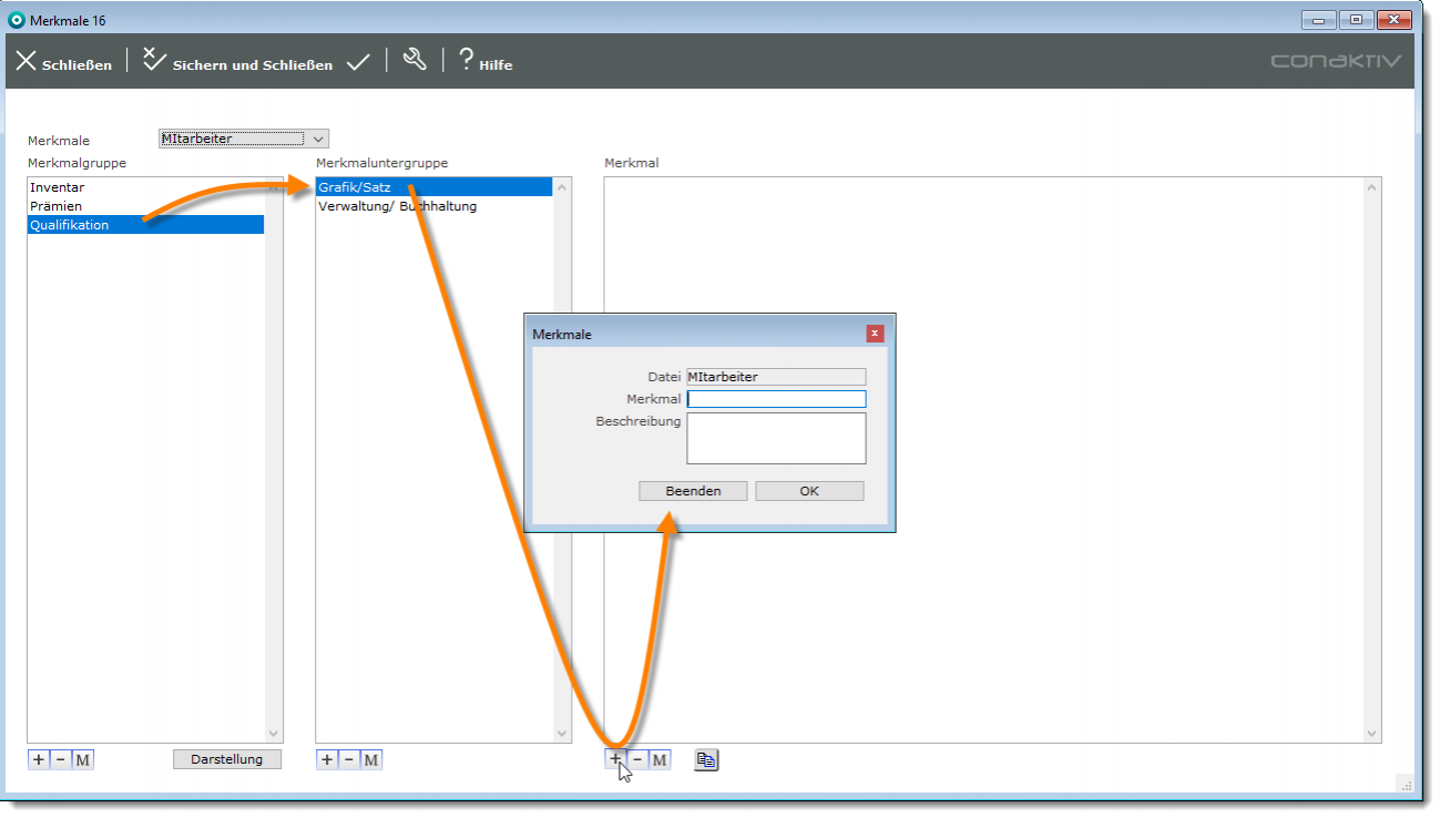 Geben Sie in dem Dialog im Feld „Merkmal“ die Bezeichnung „Software“ ein und beschreiben Sie evtl. das Merkmal kurz im Feld „Beschreibung“. Klicken Sie danach auf den Knopf „OK“. Die Felder des Dialogs werden geleert. Erfassen Sie nun die Informationen zum zweiten Merkmal, d. h., geben Sie im Feld „Merkmal“ die Bezeichnung „allgemeine PC-Kenntnisse“ ein und beschreiben Sie auch hier evtl. das Merkmal kurz im Feld „Beschreibung“. Klicken Sie wieder auf den Knopf „OK“. Die Felder des Dialogs werden geleert. Verfahren Sie ebenso mit dem letzten Merkmal der Merkmaluntergruppe „Grafik/Satz“ und beenden Sie die Eingabe durch Betätigung des Knopfes „OK“. Die Felder des Dialogs werden wieder geleert. Klicken Sie zum Abschluss auf den Knopf „Beenden“, um den leeren Dialog zu schließen. Die Merkmale werden im Bereich „Merkmale“ angezeigt.