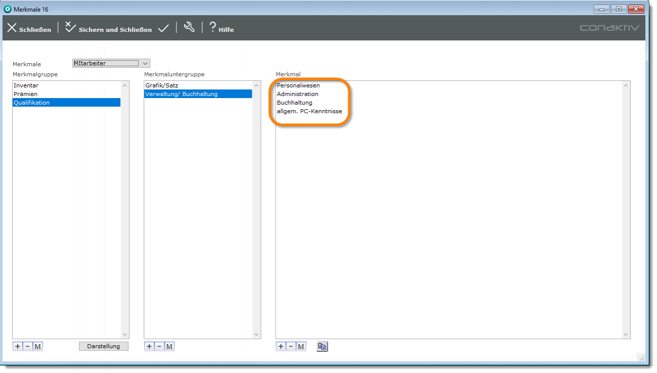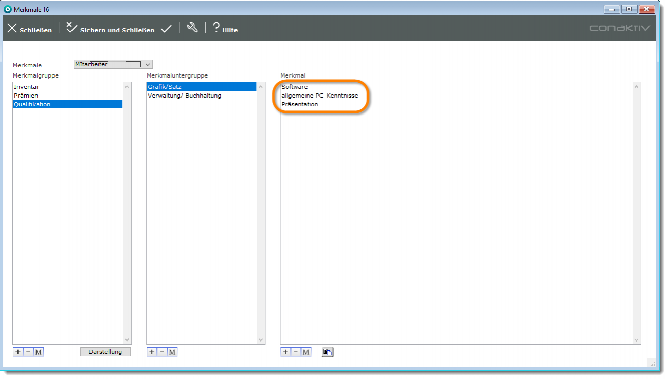 Im dritten Schritt legen Sie die Merkmale an. In unserem Beispiel werden die Auswahlpunkte in den Klappmenüs in der Bedienleiste des Registers „Qualifikation“ durch die Merkmale dargestellt.